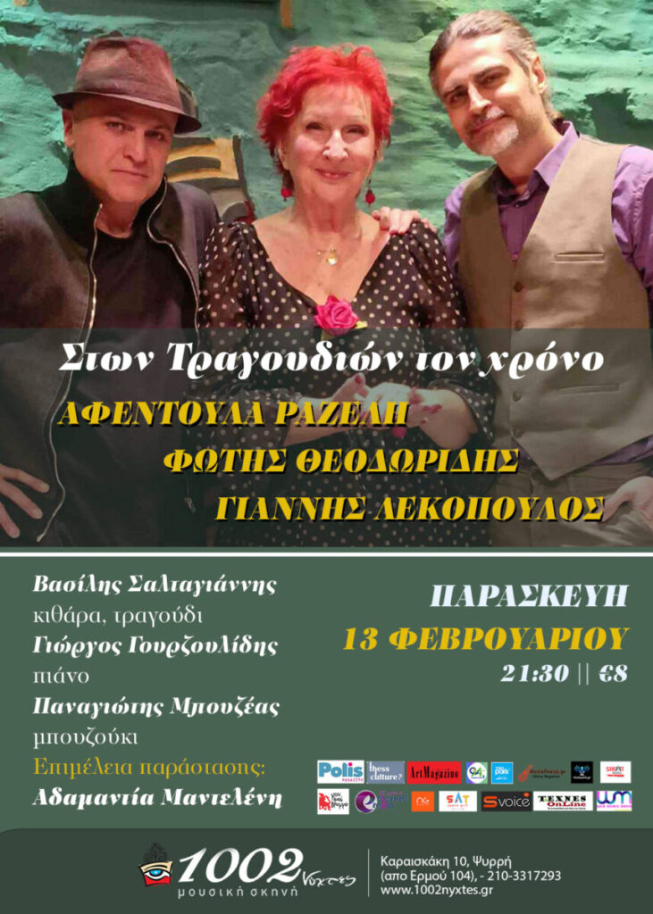 Στις ‘’1002 Νύχτες ‘’ στου Ψυρρή, την Παρασκευή 13 Φεβρουαρίου, οι τρείς αγαπημένοι ερμηνευτές , Αφεντούλα Ραζέλη, Φώτης Θεοδωρίδης και Γιάννης Λεκόπουλος ανεβαίνουν ξανά στη σκηνή, για να μας χαρίσουν μια βραδιά γεμάτη λαϊκά και έντεχνα τραγούδια, αλλά και επιλογές από τη δική τους δισκογραφία.