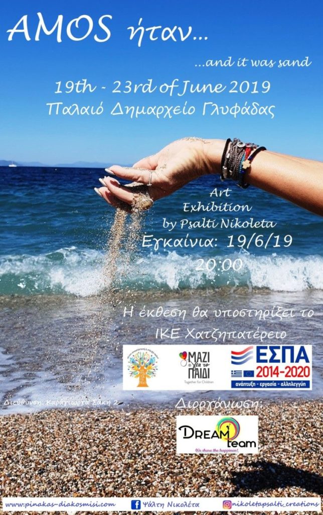 Την… διάφανη καλοκαιρινή έκθεση Τέχνης με τίτλο ‘’AMOS ήταν…’’ θα παρουσιάσει στο Παλαιό Δημαρχείο Γλυφάδας η εικαστικός Νικολέτα Ψάλτη από τις 19 έως τις 23 Ιουνίου 2019.