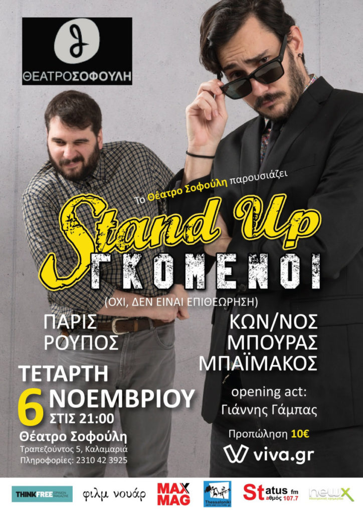 Το Θέατρο Σοφούλη αναγνωρίζοντας τη σημασία του γέλιου στη ζωή μας καθιερώνει κάθε πρώτη Τετάρτη του μήνα βραδιές stand up comedy με καταξιωμένους κωμικούς. Την αυλαία σε αυτή τη σειρά παραστάσεων ανοίγουν οι δημοφιλείς κωμικοί Πάρις Ρούπος και ο Κωνσταντίνος Μπούρας Μπαϊμάκος με την double bill παράσταση «STAND-UP ΓΚΟΜΕΝΟΙ» την Τετάρτη 6 Νοεμβρίου στις 21.00