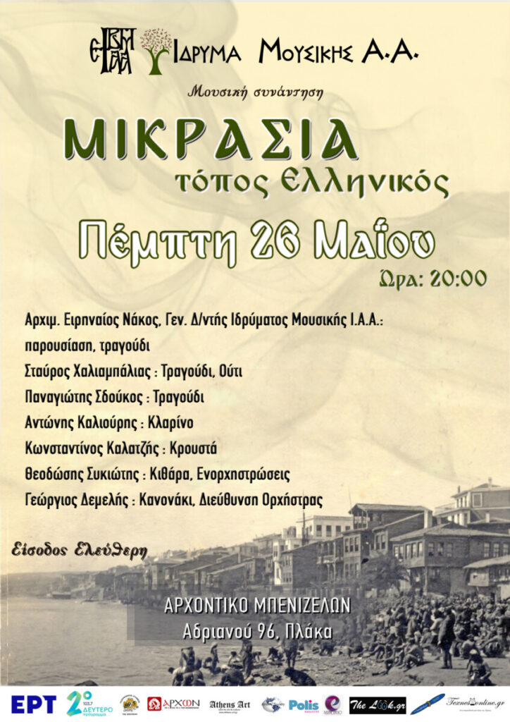 Την Πέμπτη 26 Μαΐου 2022 και ώρα 20.00, στο «Αρχοντικό των Μπενιζέλων – Οικία Αγίας Φιλοθέης της Αθηναίας», θα πραγματοποιηθεί από το Ίδρυμα Μουσικής της Ιεράς Αρχιεπισκοπής Αθηνών Μουσική εκδήλωση – Συναυλία με τίτλο: Μικρασία τόπος Ελληνικός.