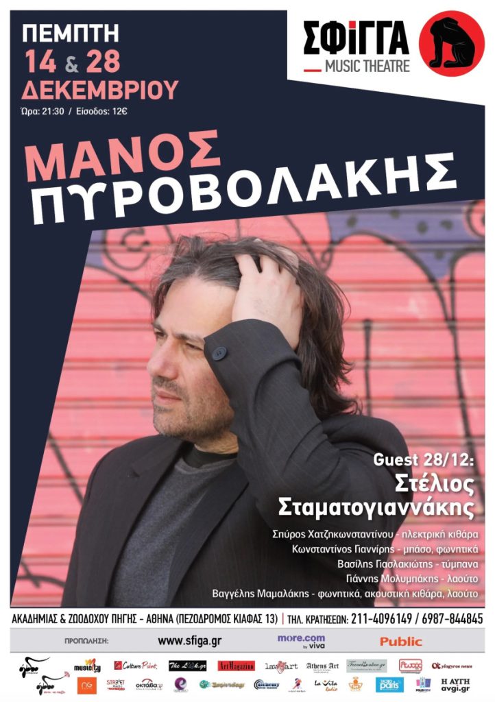 Για δύο μοναδικές βραδιές στην αγαπημένη Μουσική Σκηνή Σφίγγα, ο Μάνος Πυροβολάκης θα παρουσιάσει ένα πολυποίκιλο πρόγραμμα γεμάτο εναλλαγές. Μια πρόταση για το δικό του κρητικό – rock πάλκο, διανθισμένο με τραγούδια που αγαπάει. Παράλληλα με τις επιτυχίες του : ‘Το Χαμόγελο σου’, ‘Τι μας ενώνει’, ‘Όλα για όλα’,’ Στης εκκλησιάς την πόρτα, ‘Αν η αγάπη’, ‘ Μπορεί να βγω’ , κ.α. που όλοι έχουμε σιγοτραγουδήσει, μας παρουσιάζει διασκευές όπως τα “Συρτά του Ροδινού” και “Σ’ αυτό τον κόσμο” κάνοντας πάντα αναφορά στην Κρητική παράδοση και όχι μόνο, μέσα από τη δική του αισθητική προσέγγιση.