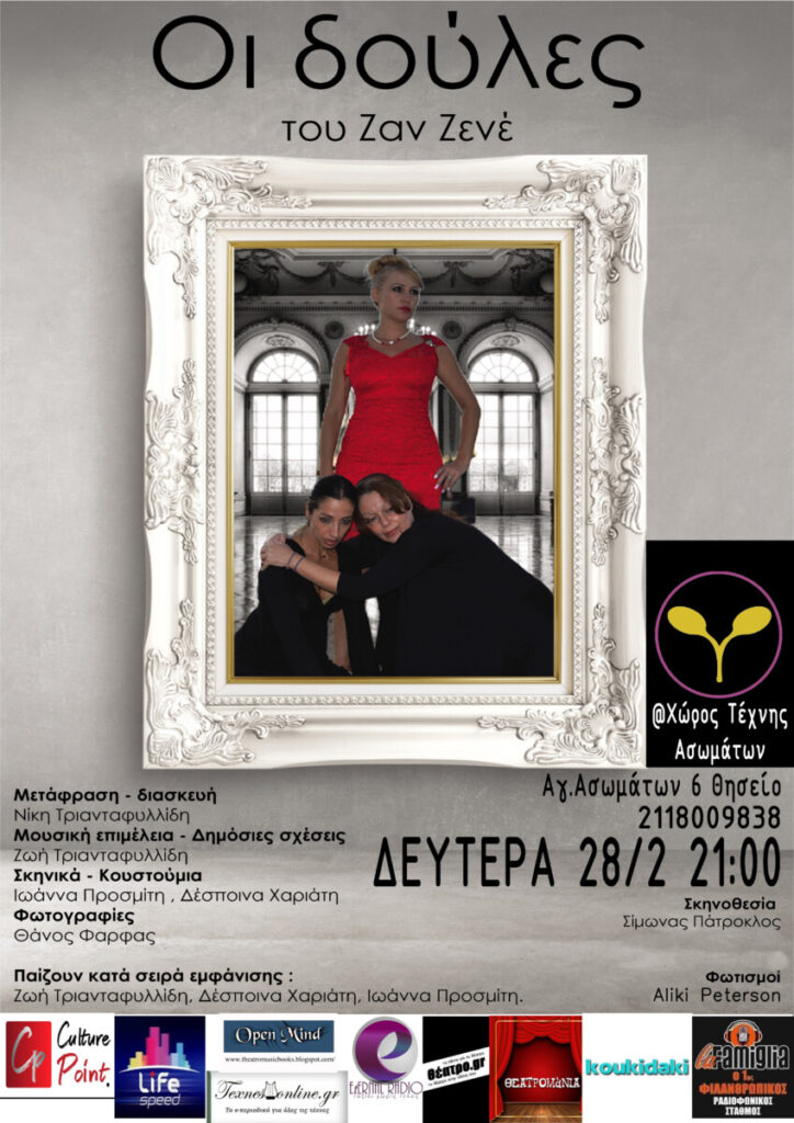 Οι Δούλες δεν βρίσκουν άλλο τρόπο για να δραπετεύσουν από την πραγματικότητα παρά παίζοντας ένα παιχνίδι – θέατρο. Γρήγορα κι απότομα όμως προσγειώνονται στην ωμή πραγματικότητα φτάνοντας σε αδιέξοδο.