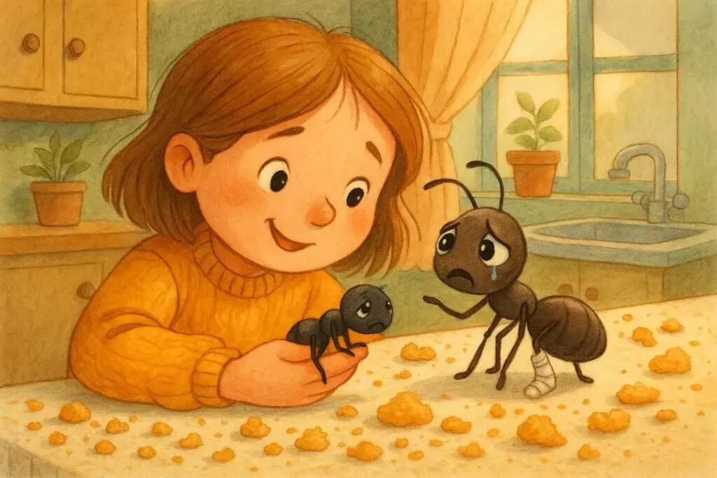 Το μυρμηγκάκι μιλούσε συνέχεια και συγχρόνως μάζευε ψίχουλα, τα είχε κάνει ένα μικρό βουναλάκι.