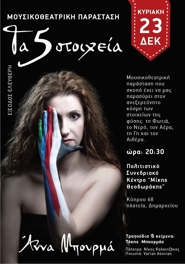 “Τα 5 Στοιχεία” της Άννας Μπουρμά για πρώτη φορά θα βρεθούν στις εκδηλώσεις του Δήμου Ελληνικού- Αργυρούπολης “Όλη η πόλη μια γιορτή” στο υπέροχο πολιτιστικό συνεδριακό κέντρο ”Μίκης Θεοδωράκης” την Κυριακή 23 Δεκεμβρίου .