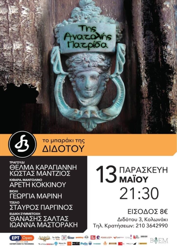 Μέσα από τα γυρίσματα της Ιστορίας πολύ συχνά η “Πατρίδα” γίνεται “Όπου γης Πατρίδα”. Τα χρώματα της μνήμης, όμως, μένουν. Στο πρόγραμμα “Της Ανατολής Πατρίδα” οι ερμηνευτές Θέλμα Καραγιάννη και Κώστας Μάντζιος συμπράττουν με την συνθέτη Αρετή Κοκκίνου παρουσιάζοντας εικόνες μνήμης του ελληνισμού της Ανατολής, μέσα από παραδοσιακά και σύγχρονα τραγούδια.